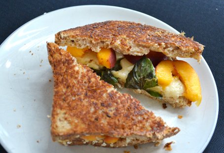 1. Assuming the peaches and cheese are sliced, spread butter or mayo on each side of the bread.